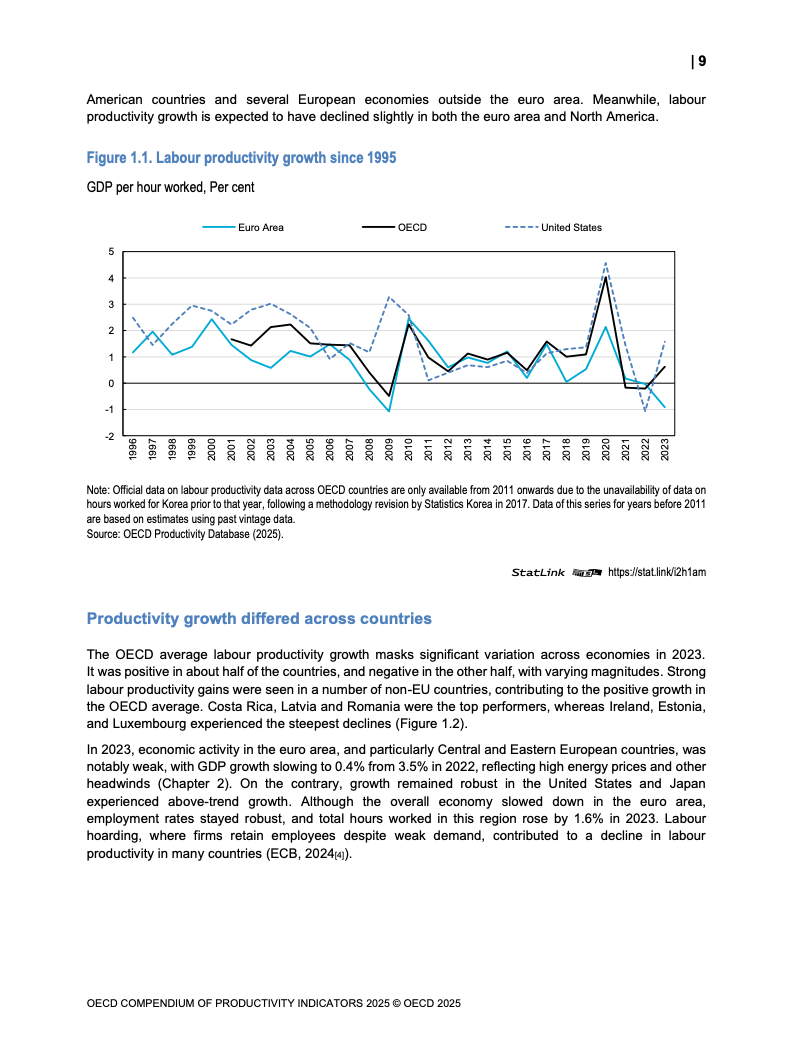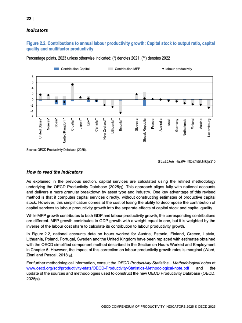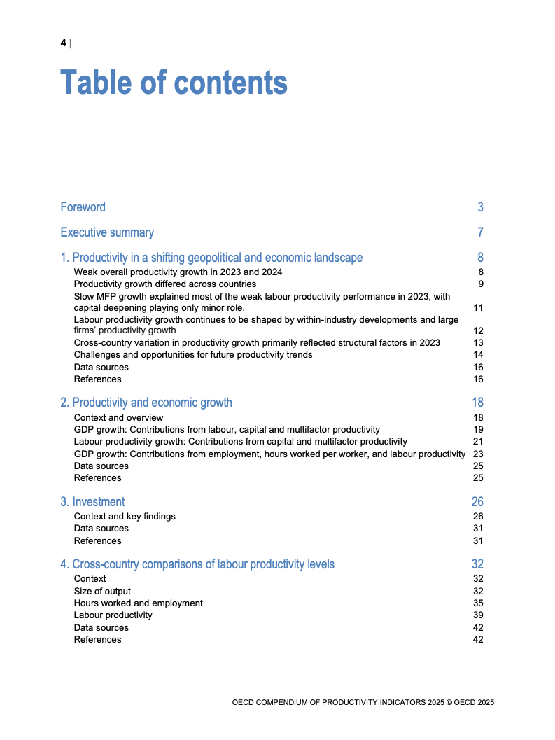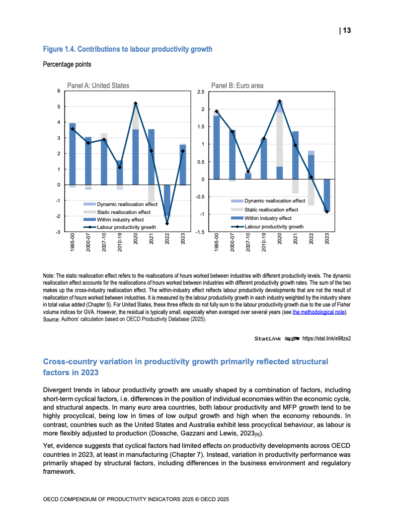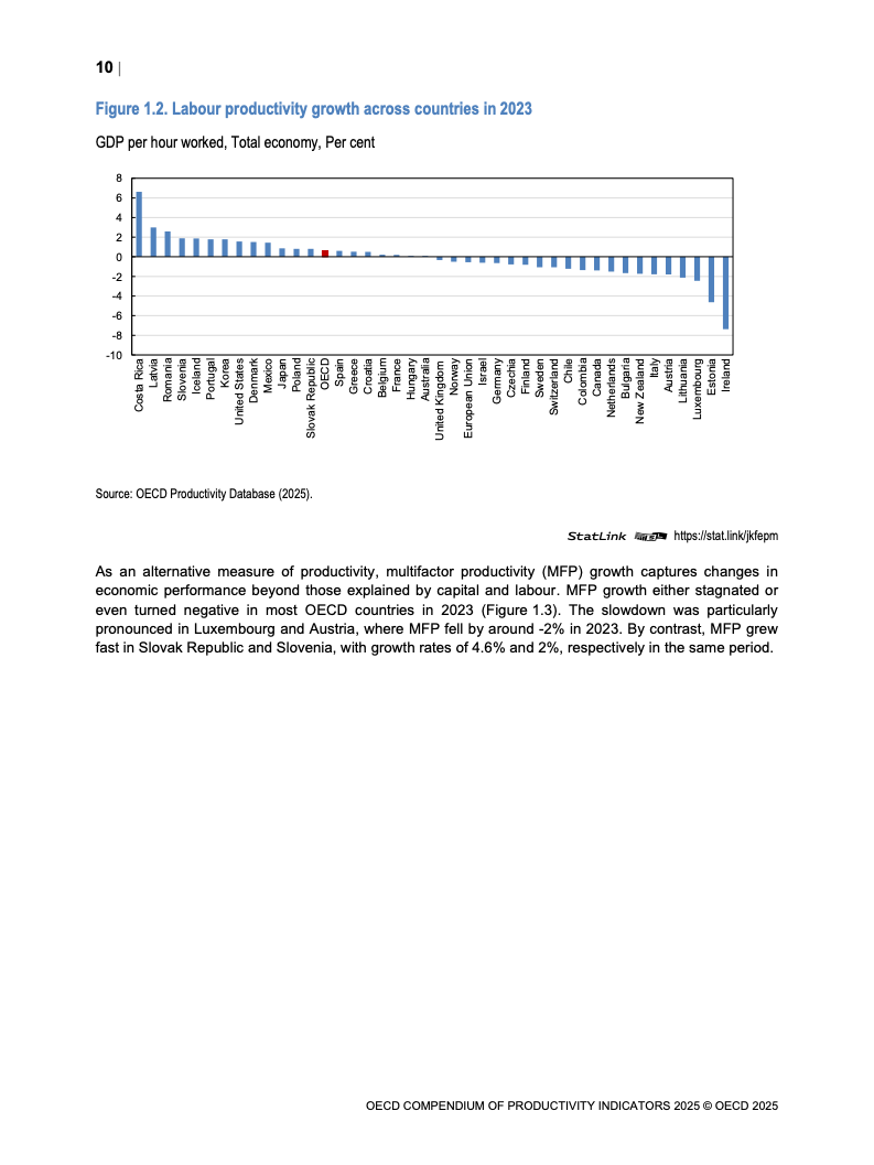 全球生产力增长呈现低迷态势。2023年OECD经济体劳动生产率平均仅增长0.6%,而欧元区则录得负0.9%的显著下滑,为2009年金融危机以来的最差表现。增长动力主要源于劳动投入量的增加,而非效率提升。多要素生产率(MFP)的停滞乃至负增长,以及资本深化贡献的微弱,是导致这一疲软局面的核心驱动因素。