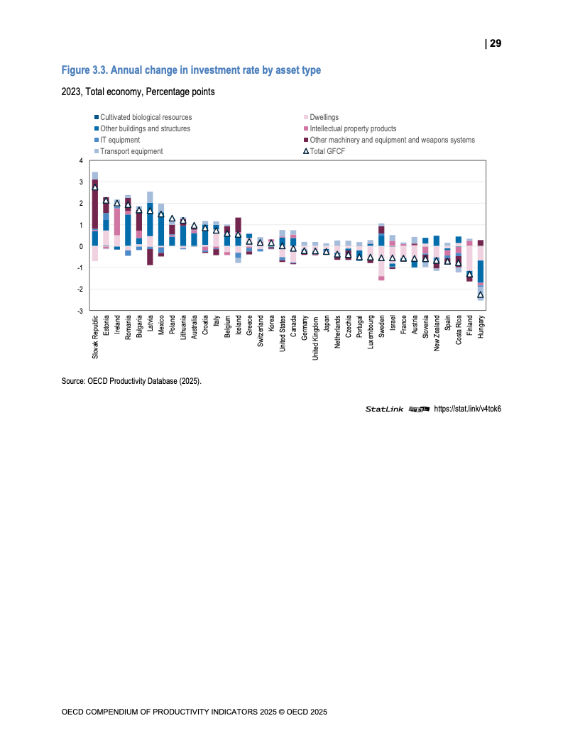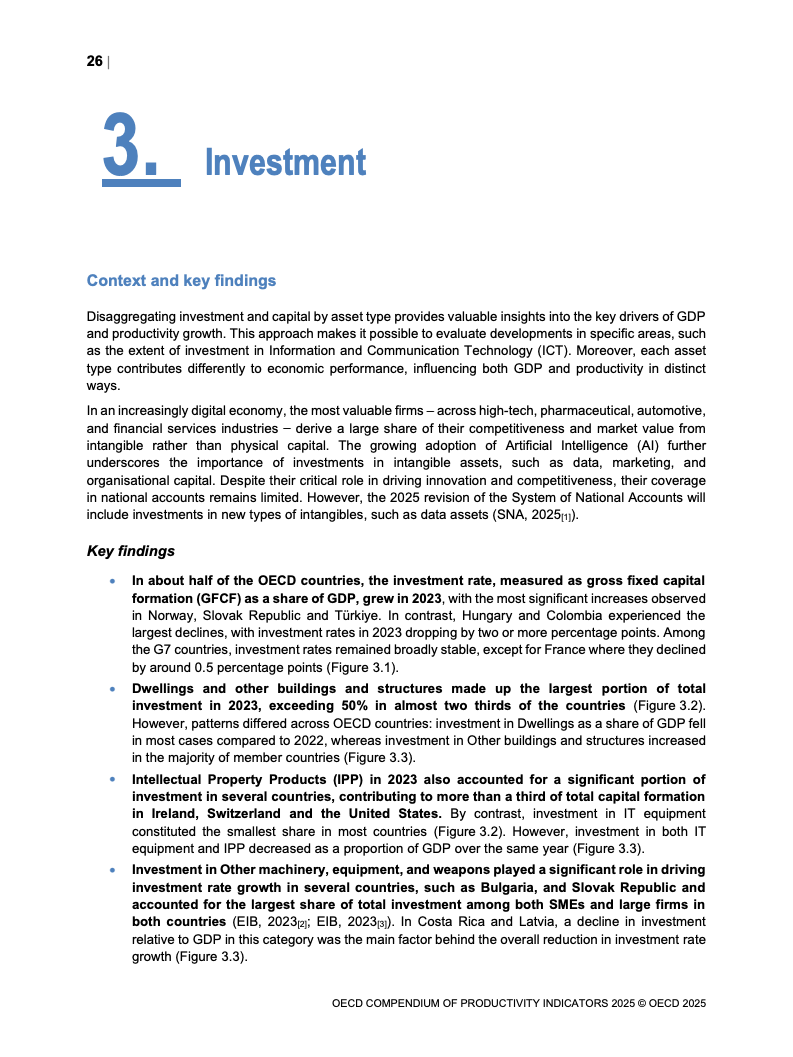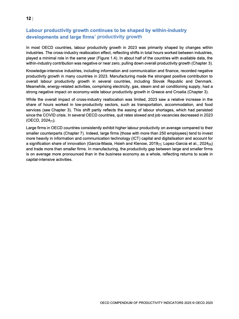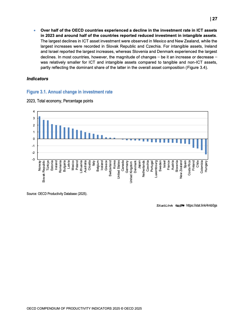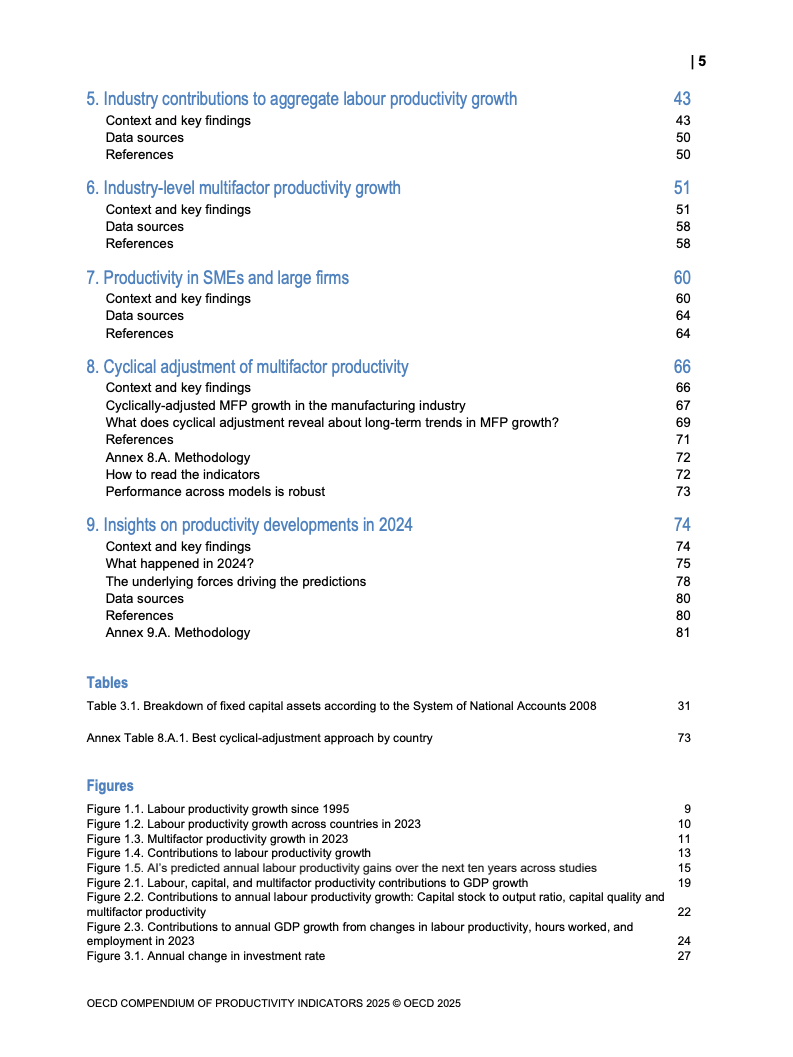 全球生产力增长呈现低迷态势。2023年OECD经济体劳动生产率平均仅增长0.6%,而欧元区则录得负0.9%的显著下滑,为2009年金融危机以来的最差表现。增长动力主要源于劳动投入量的增加,而非效率提升。多要素生产率(MFP)的停滞乃至负增长,以及资本深化贡献的微弱,是导致这一疲软局面的核心驱动因素。