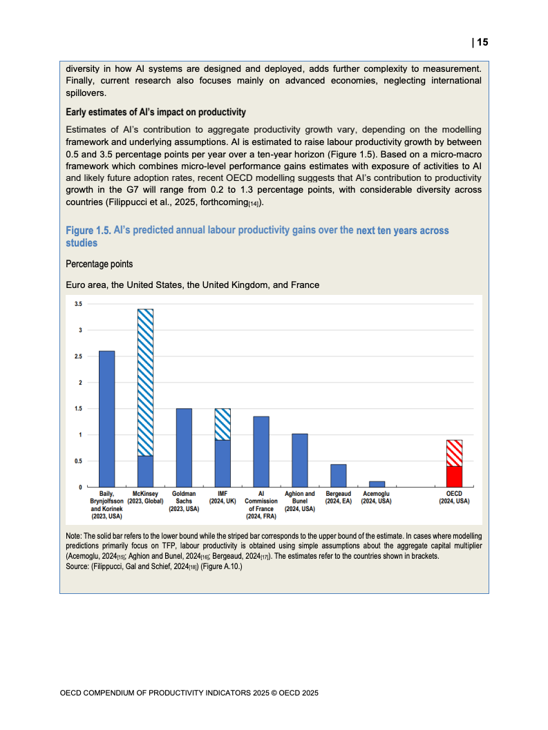 投资结构与技术应用揭示了更深层次的问题。尽管部分国家投资率上升,但资本正从信息通信技术(ICT)和知识产权产品(IPP)等高生产力领域,转向建筑与传统机械设备。备受关注的人工智能技术,其宏观经济红利尚未显现,模型预测其对G7的长期年均贡献也仅在0.2至1.3个百分点之间,且依赖配套改革。