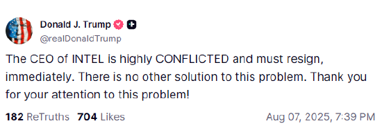 快科技8月8日消息,昨晚特朗普突然在社交媒体上喊话,要求英特尔刚上任的华人CEO辞职。