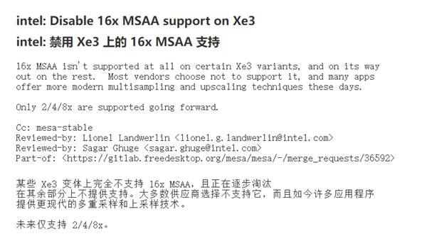 Intel工程师在更新日志中写道:“16x MSAA在某些Xe3变体上完全不被支持,并且正在其他变体上逐步淘汰。大多数供应商选择不支持它,许多应用程序现在提供了更现代的多采样和上采样技术。未来仅支持2x、4x和8x。”