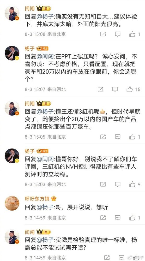 随着讨论热度不断攀升,双方的互动也愈发激烈。杨子提出了一个假设性的问题:“不考虑价格,只看配置,现在就把豪车和20万以内的车放在你眼前,你会选哪个?”而闫闯则回应称,“欢迎来看国产车打脸懂王”,并指出杨子可能并不了解当前市场上的一些热门国产车型。彼时,不少网友也纷纷下场,或支持国产汽车,或支持海外豪华品牌。