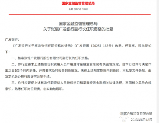 上个月,国家金融监督管理总局发布了批复,核准张恺广发银行股份有限公司副行长的任职资格,张恺正式上任广发银行副行长。
