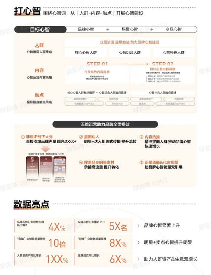 其次,围绕心智词,从“人群-内容-触点”开展心智建设,包括开启非遗IP线下大秀、合作星图达人矩阵式传播、内容热推、搜索品转承接高流量转化以及明星直播。