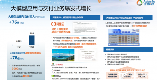 根据财报显示,亚信科技上半年大模型应用与交付收入0.26亿元,同比增长超76倍,订单金额同比增长超78倍,呈现爆发式增长。