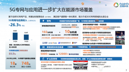 2025年上半年,亚信科技5G专网与应用业务已签订单金额约为人民币0.82亿元,同比增长51.7%。受核电部分订单延迟、收入确认滞后影响,5G专网与应用业务收入约为人民币0.47亿元。下半年,公司将加速推动订单转化,业绩将实现高速增长。