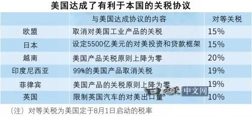 河浪武史:就连重视国际规则的欧盟也甘愿接受“不平等协议”。在对美谈判达成协议的6个国家和地区中,除日本和英国之外,其余4个国家和地区均表示将削减或取消对美国产品的关税。这是霸权国家对贸易的“力量支配”……