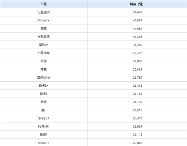 其他表现亮眼的车型还包括海豹06(31,248辆)、比亚迪秦(29,392辆)、轩逸(29,000辆)等。