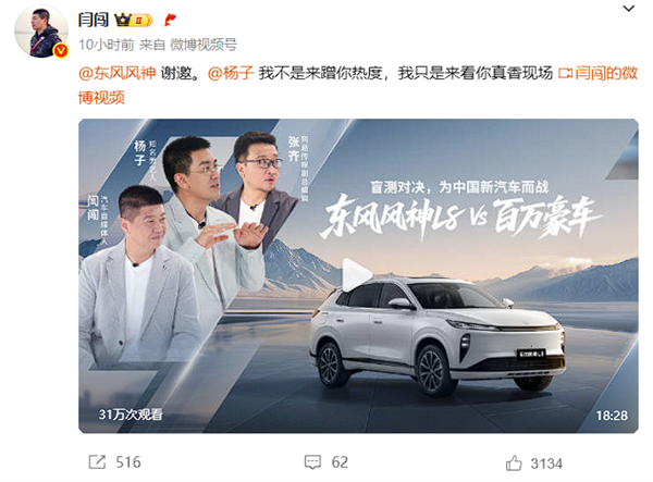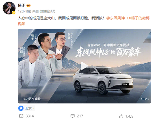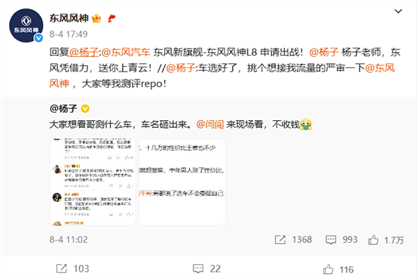 当天,闫闯和杨子两人先后转发了一段名为 “东风风神L8VS百万豪车盲测对决” 的测试视频,标题为 “为中国新汽车而战”,邀请的嘉宾就包括此次事件的主角。
