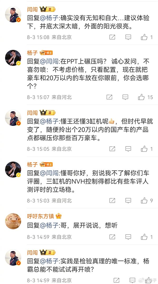 闫闯再度回应: “欢迎来看国产车打脸懂王”,并表示杨子 “认识的国产车可能不多”,建议选网红款进行实测。