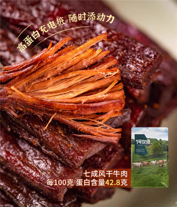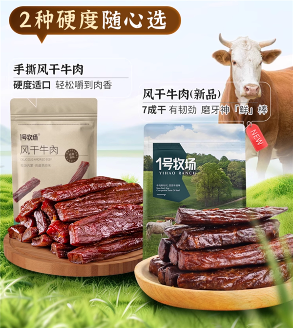 天猫【1号牧场旗舰店】1 号牧场风干牛肉 250g 日常售价为 58 元,下单领取 16 元优惠券 + 叠加立减,到手价为 35 元半斤。