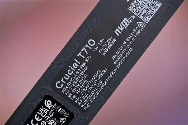 英睿达T710 Gen5 NVMe固态硬盘采用先进的美光232层TLC NAND构建,加上采用单面设计具备低功耗优势。