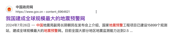 比如去年地震局公布过,咱们国内已建设了15899个观测站,是全球规模最大的地震预警网。