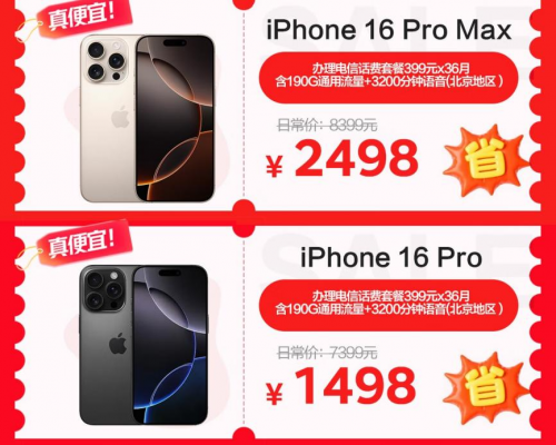 iPhone 16 Pro系列是不少消费者换新首选,可以选择通过“京补合约”方式下单。北京地区消费者办理电信话费套餐399元×36月,iPhone 16 Pro Max到手价2498元,iPhone 16 Pro到手价1498元,套餐含190G通用流量和3200分钟语音。