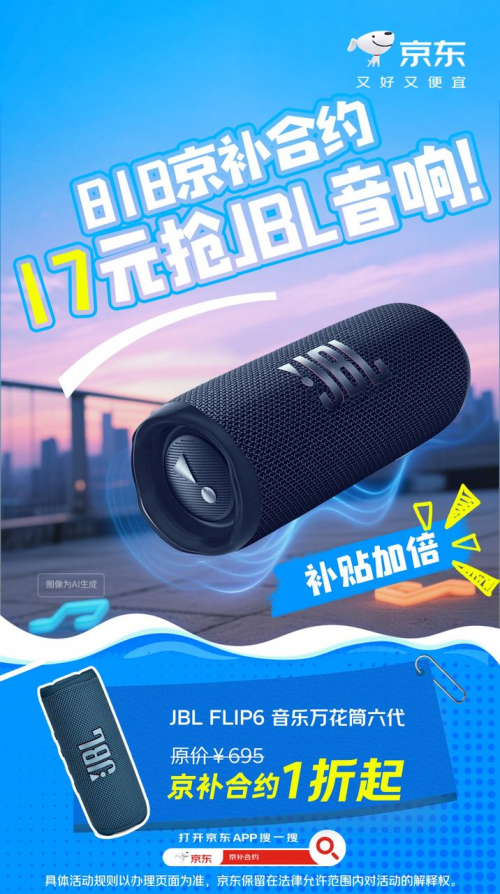 经常锻炼的消费者可以考虑JBL FLIP6 音乐万花筒六代,支持IP67级防尘防水,适合多样环境;内置4800mAh电池,续航持久;音质澎湃动人。部分地区消费者通过“京补合约”入手这款音响仅需17元。