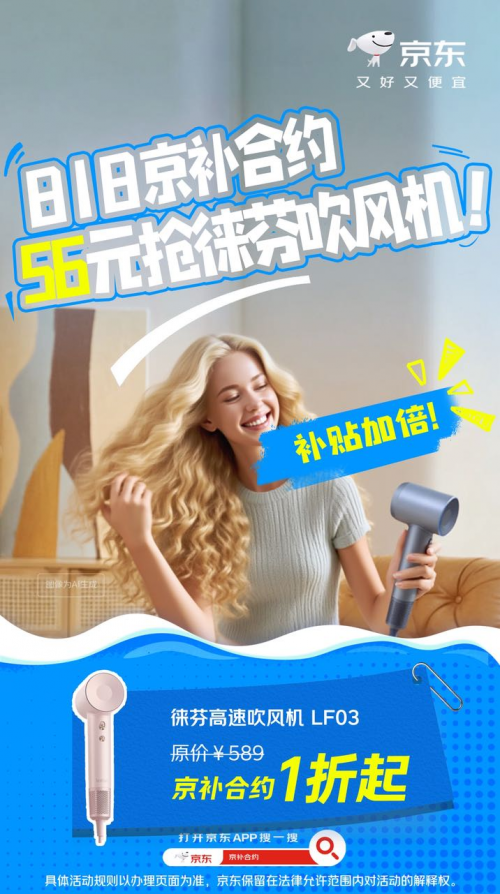 除了手机,通过“京补合约”方式还能入手数码、小家电好物,低至1折起。其中,徕芬高速吹风机LF03搭载第3代干发黑科技,更快吹干,同时轻约407g,配置六重降噪,重量与声音都更轻,部分地区消费者通过“京补合约”入手仅需56元。