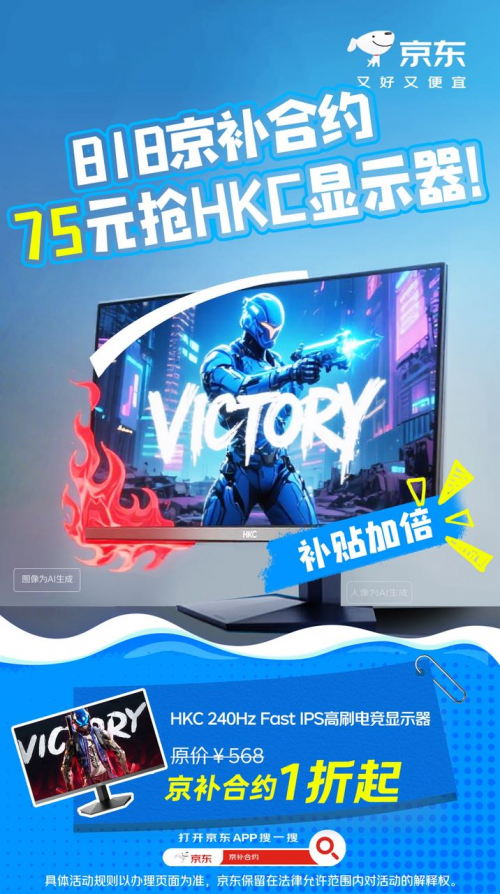 喜欢电竞的消费者少不了一款优质显示屏。HKC 240Hz Fast IPS高刷电竞显示器,23.8英寸黄金电竞尺寸,支持240Hz超速高刷、1ms响应速度,开启HDR可进一步提升画质,游戏体验优异,还支持硬件级低蓝光,更护眼,部分地区消费者通过“京补合约”下单仅需75元。
