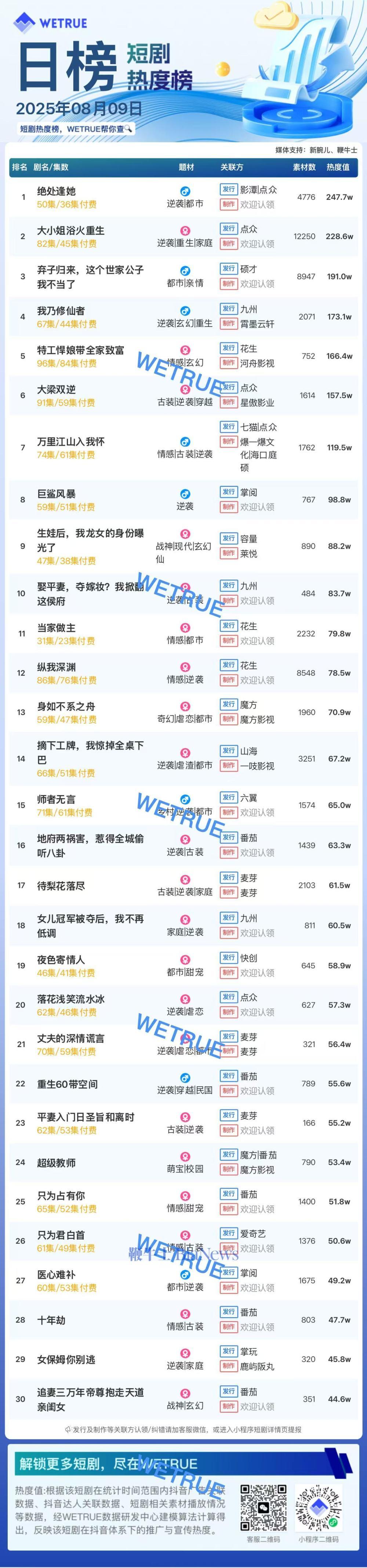 1、本日榜为WETRUE短剧数据公司提供,新腕儿和鞭牛士提供联合支持。