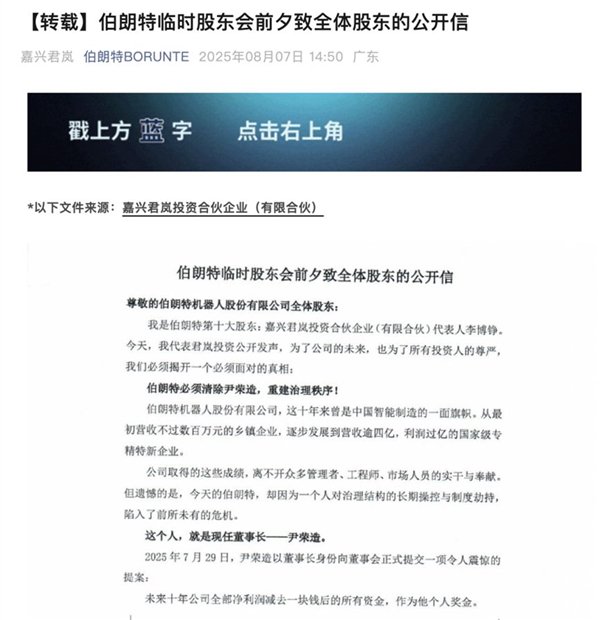紧接着,伯朗特机器人的微信公众号发布了一封致全体股东公开信,在其中细数了该公司创始人尹荣造的“几宗罪”。