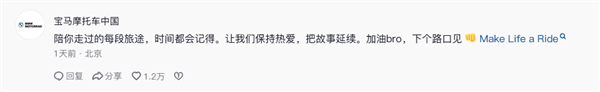 此事引起网友热议,宝马摩托车中国官方也评论道:陪你走过的每段旅途,时间都会记得。让我们保持热爱,把故事延续。加油bro,下个路口见,Make Life a Ride。
