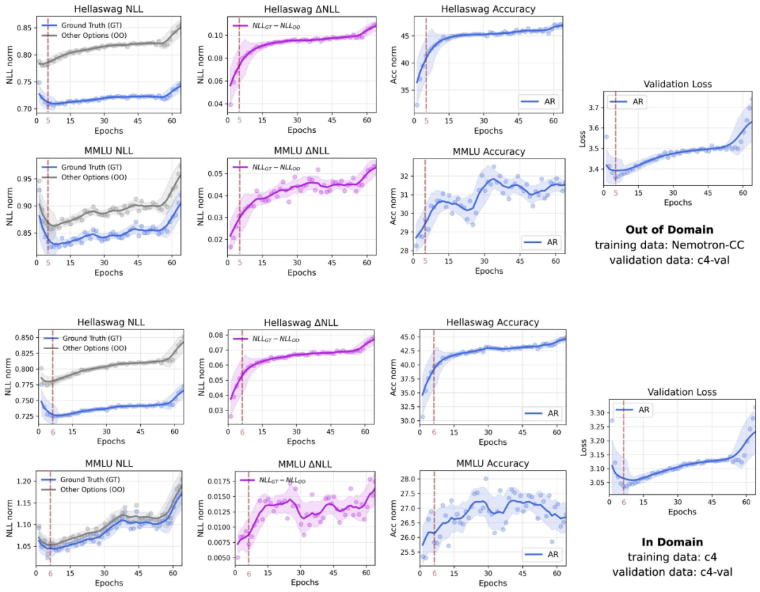团队可视化了多选评测中,真实答案与其他选项的平均负对数似然(NLL),以及它们之间的差值(△NLL)。即使在验证集上出现「过拟合」后,真实答案与其他选项的 NLL 差距(△NLL)依然持续扩大,这表明尽管验证损失在上升,模型的底层判别能力仍在不断提升。这一现象在域内数据和域外数据的训练中都同样存在。