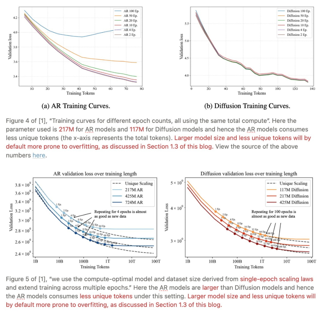 此外,[1] 在比较 AR 与扩散模型的过拟合趋势时,为 AR 使用了更大的模型规模和更少的唯一训练 token 数量。这种设置并不公平,因为更大的模型在训练数据多样性不足的情况下,本身就更容易更早出现过拟合。