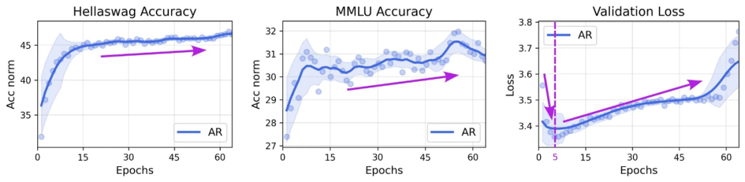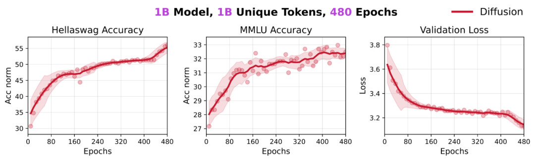 为了研究 DLM 训练中 token 的全部潜力,团队进行了额外实验:将同一份 10 亿 token 的数据集重复训练 480 个 epoch,总训练量达到 4800 亿 tokens。结果显示,模型在 HellaSwag 上取得约 56% 的准确率,在 MMLU 上取得约 33%,显著优于 AR 的约 41% 和约 29%。