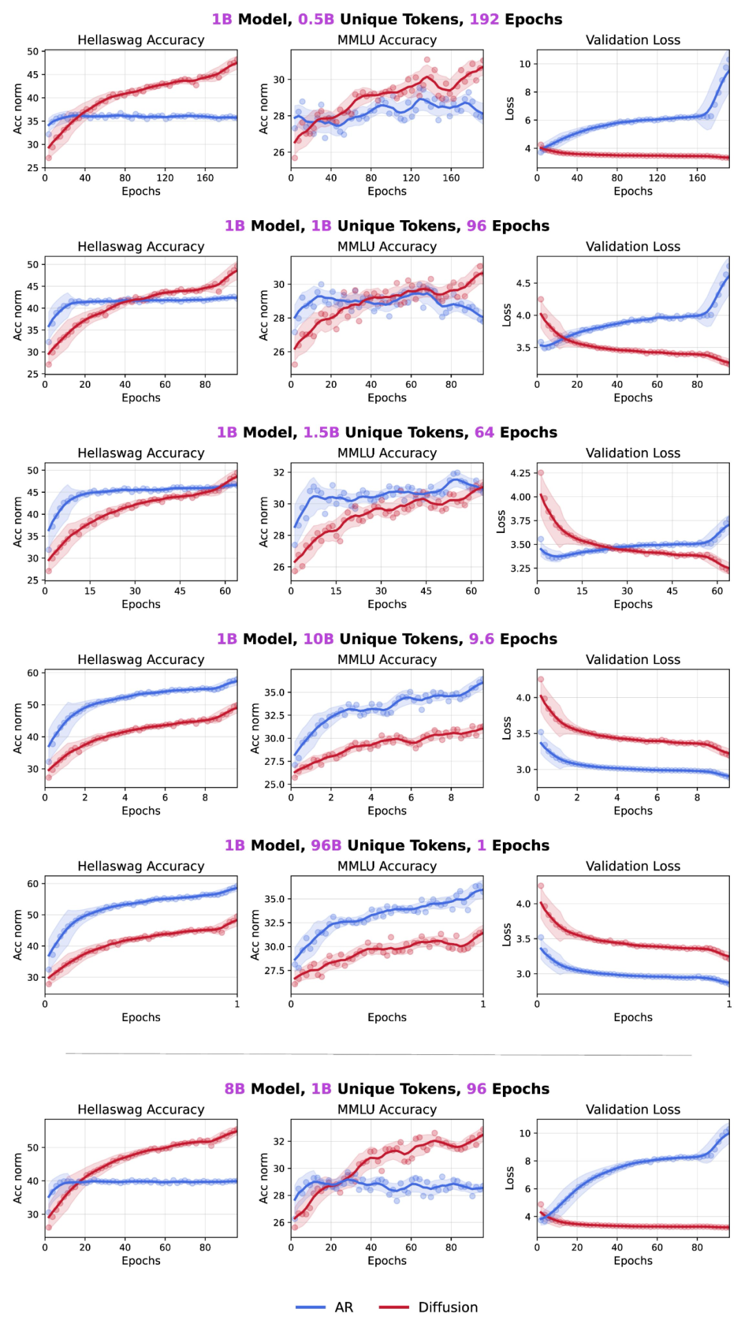 针对这一现象,该团队从零开始预训练了扩散语言模型(DLMs)与自回归(AR)模型,其中规模最高至 80 亿参数、4800 亿 tokens、480 个 epoch。