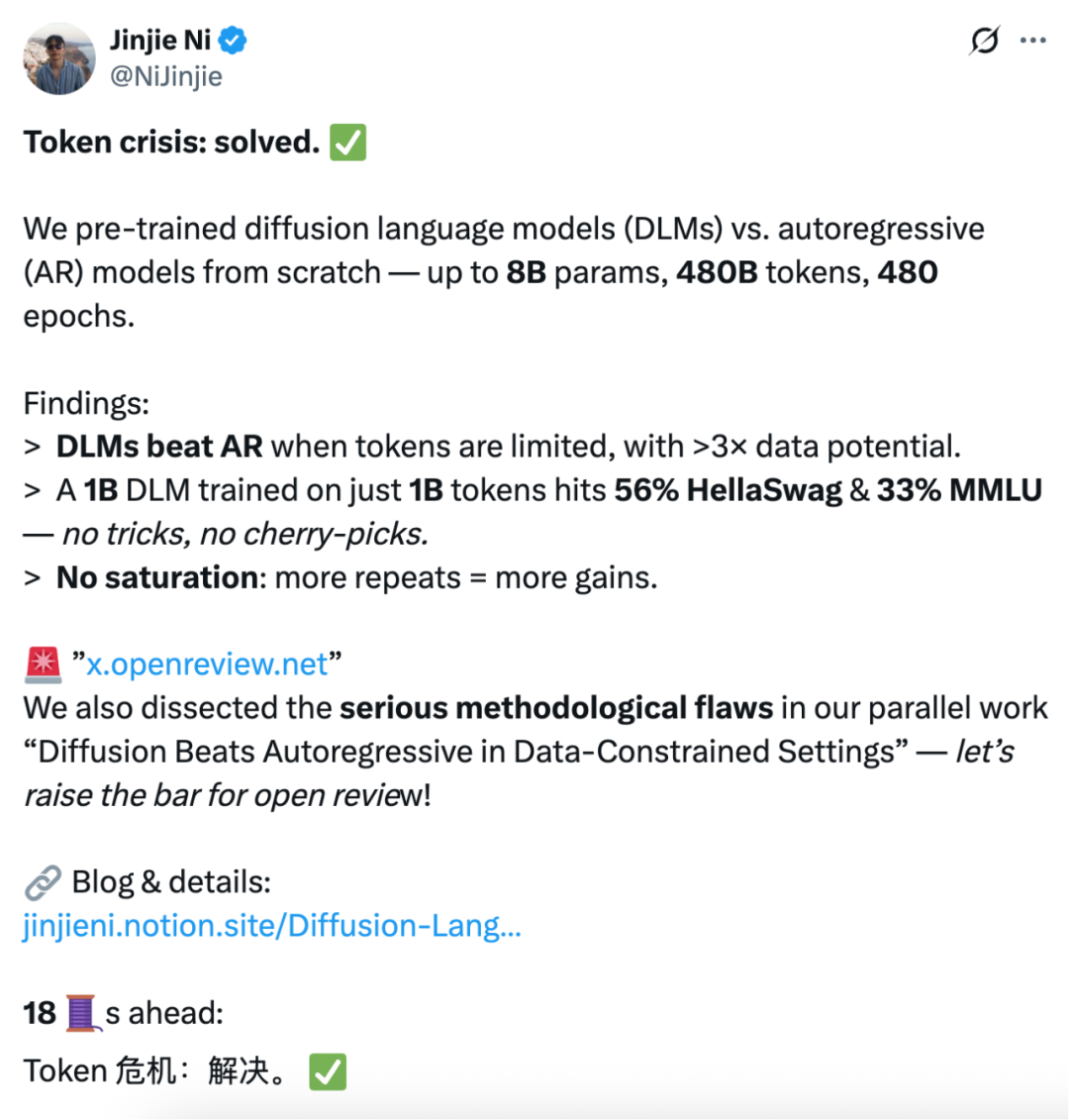 Jinjie Ni 在社媒 X 上详细介绍了其团队的研究结论、研究方法,接下来我们一一来看。