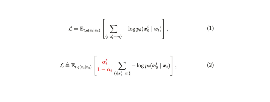 在 [1] 的所有实验中,研究者使用了损失函数 (1),但未做出明确的理论解释。然而,这个损失函数与理论基础更扎实、被广泛采用的掩码扩散语言建模损失 (2) 有显著差异。从理论上可以证明损失函数 (1) 并不能忠实地表示模型似然,这可能会对其结论造成严重影响。