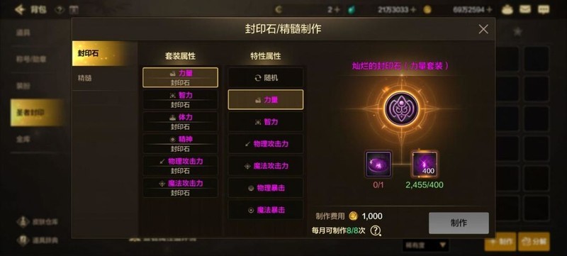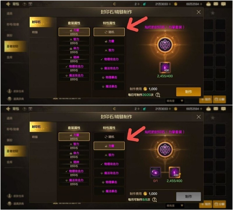 在制作页面中,玩家可自行选择套装属性与特性属性。套装属性用于生成套装效果,一般会选择力量/智力或物理攻击力/魔法攻击力来增强角色的输出能力(目前仅支持生成2件套效果);特性属性也被称作大词条,制作时可选择随机或指定属性,若选择指定特性属性,则需要消耗一枚凝结的混沌之息。