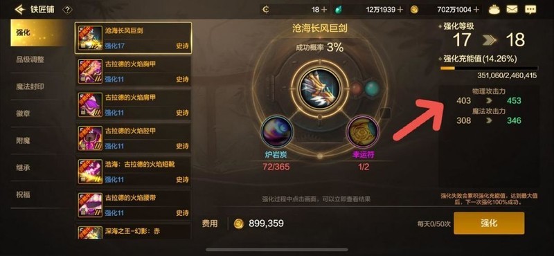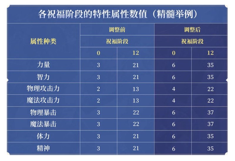 精髓祝福12阶属性调整,力量由21提升至35,物理攻击力由13提升至22。