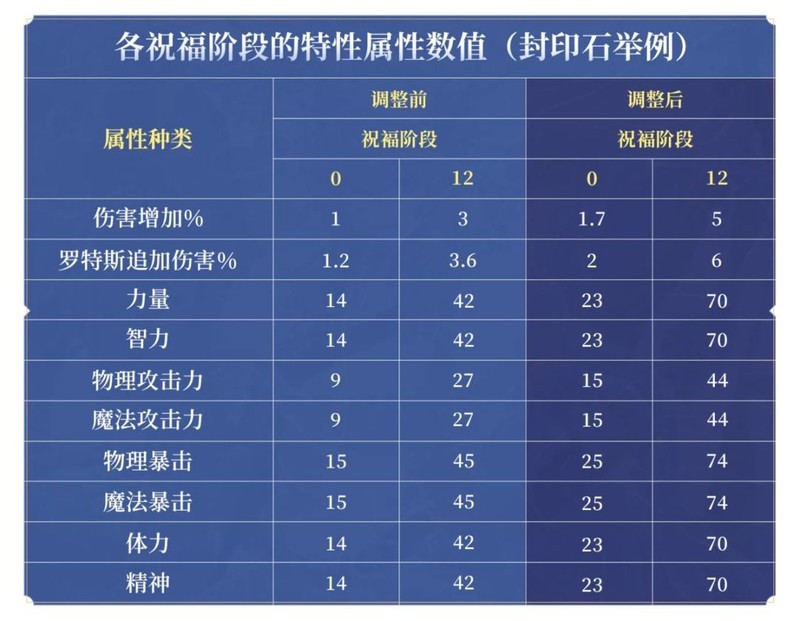封印石祝福等级提升至12阶,力量由42增至70,物理攻击力由27调整为44。
