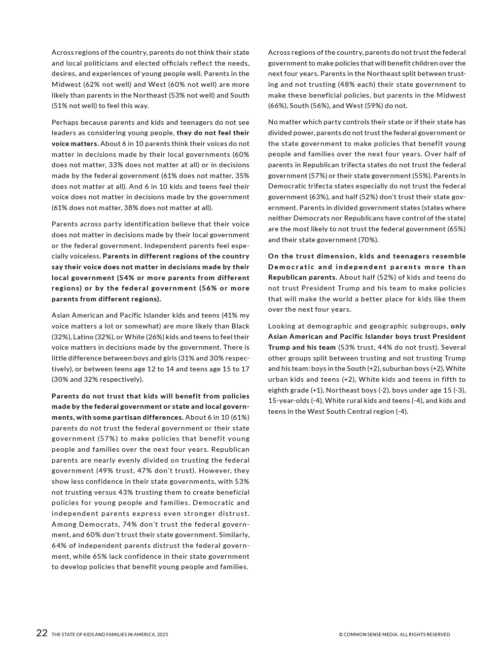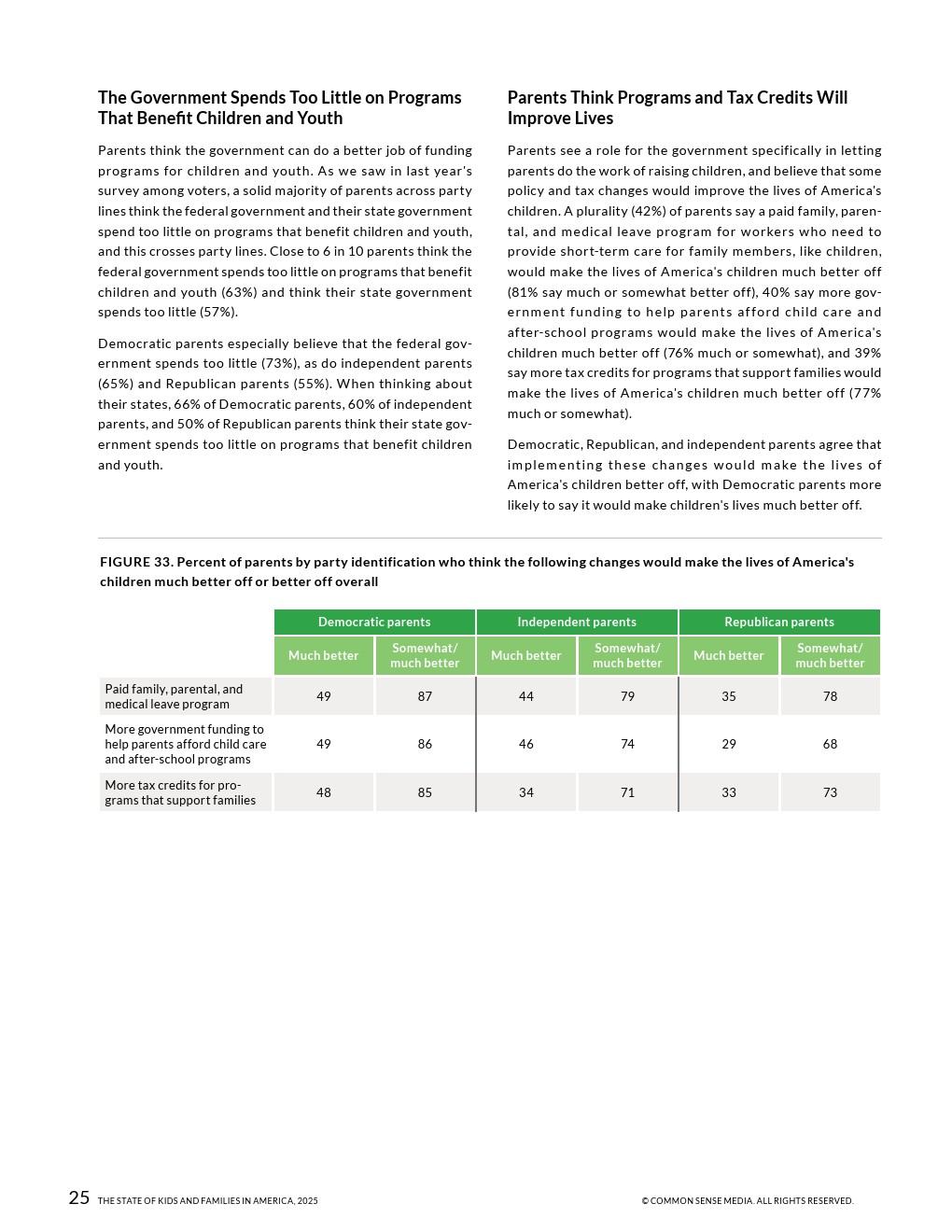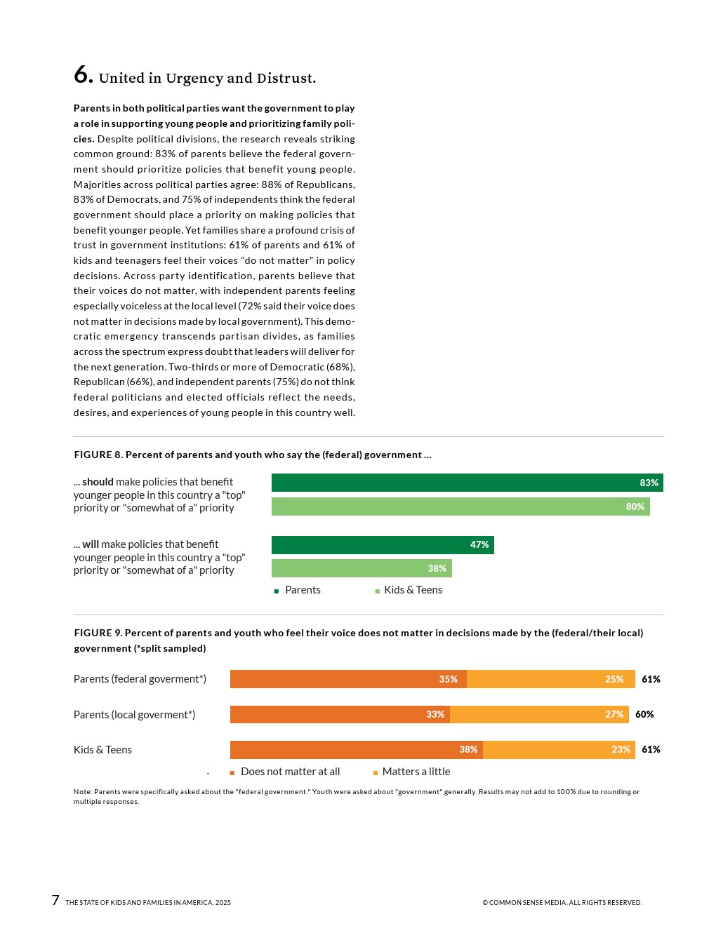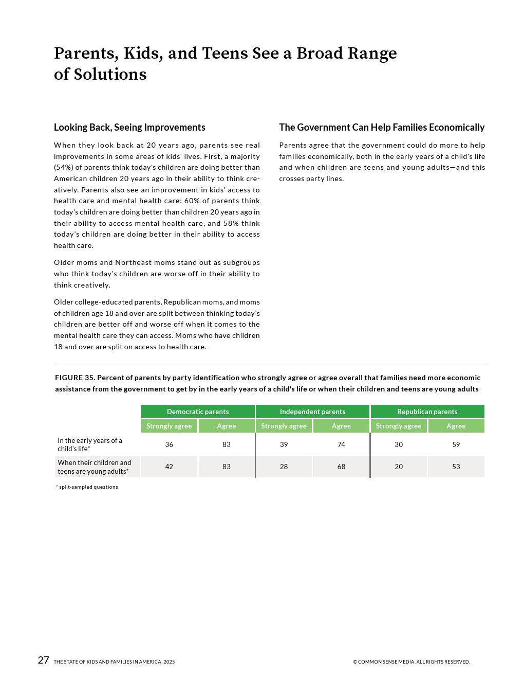 随着特朗普政府的上台,美国家庭正处在多重行业重大变革的关键十字路口。与传统认知不同,跨党派家长在许多关切议题上高度一致,都支持通过以下方式改善家庭和儿童生活:优质教育、州和联邦层面的积极政策与投资,以及更稳固的家庭结构。家长和青少年都认为,当选领导人和政客没有充分优先考虑儿童及青少年的政策,应该在儿童和家庭领域加大投入。尽管国家存在分歧,但不同政治立场的家长在应对挑战的实际路径上存在大量共识。
