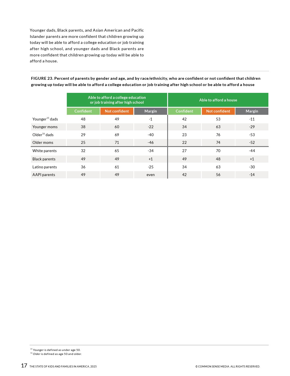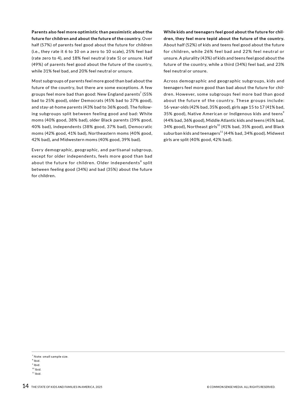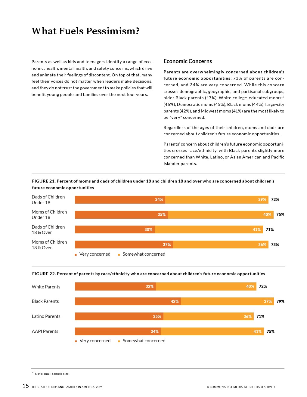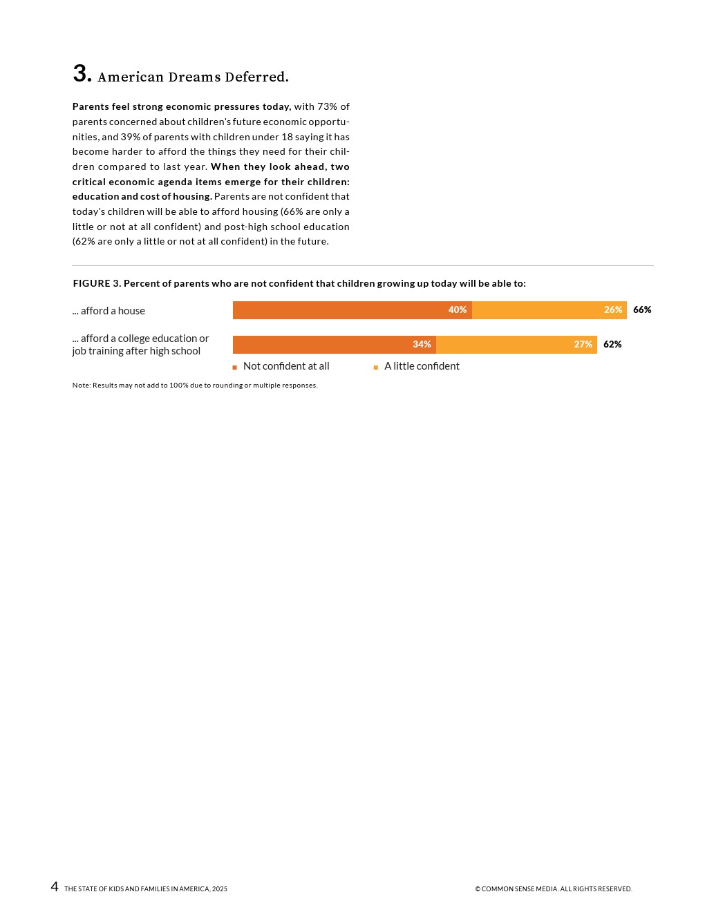 家长和青少年对当前儿童与家庭的处境存在显著担忧,主要包括:需要提升教育质量、扩大心理健康服务覆盖、加强监管以改善青少年的科技与社交媒体体验,以及政府应更好地满足家庭基本需求。展望未来时,家长和青少年更多表现出希望而非恐惧,但住房负担能力和高等教育费用仍是家长们的主要焦虑源。