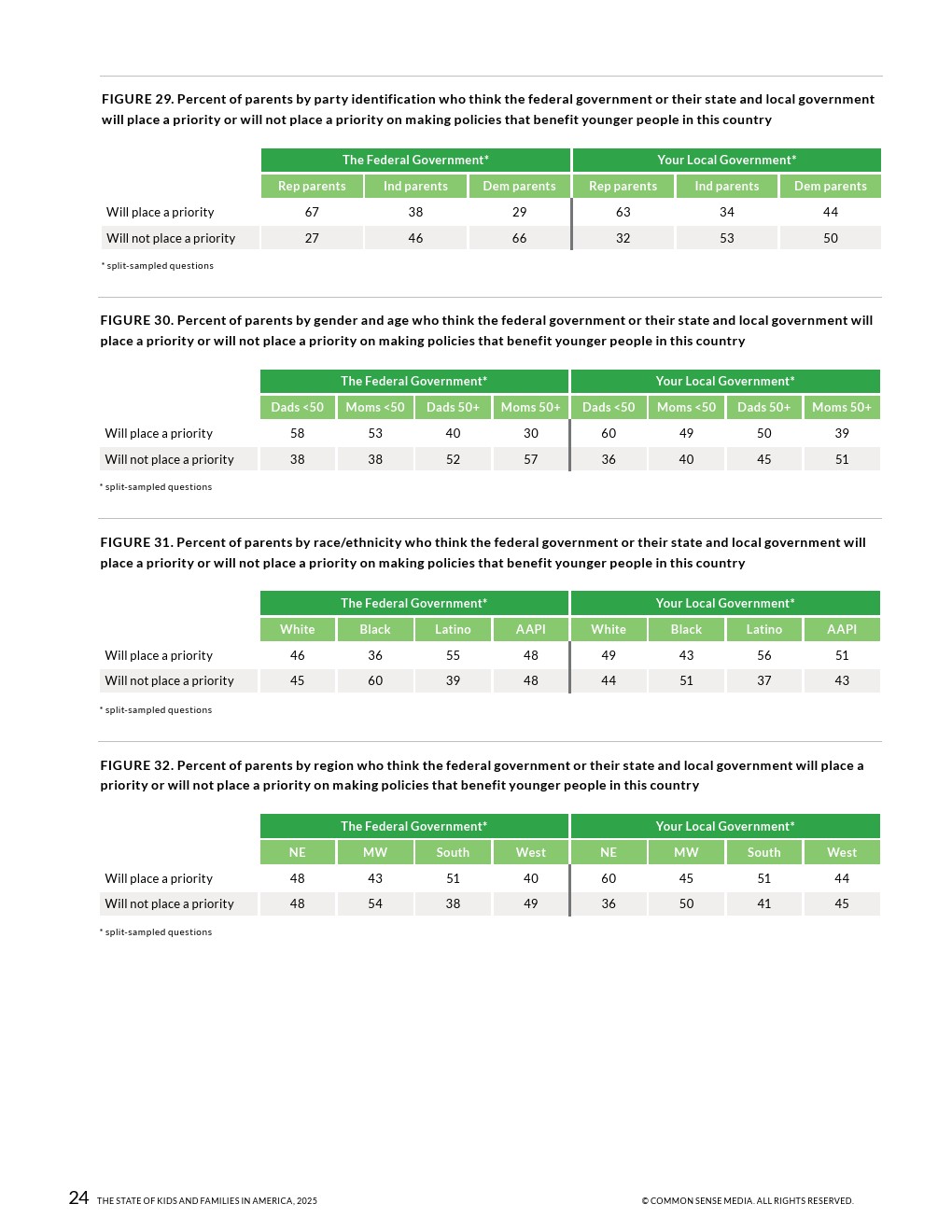 2024年,常识媒体曾发布一项涵盖潜在选民(包括家长选民)及青少年的调查。去年的调查显示,家长选民与非家长选民同样关注经济问题和美国儿童的未来。调查结果呈现出强烈的延续性——今年的家长与去年的选民都认为教育改革存在切实机遇,并呼吁采取行动保障青少年心理健康。与今年情况类似,去年跨党派受访者都支持加大对儿童和家庭的投入,认可政府应发挥作用,并认为政客们未能履行责任。