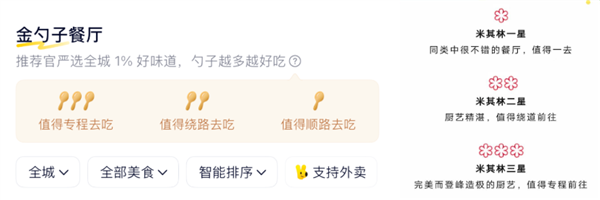 一个是评分系统:金勺子餐厅。虽然同样也是食客们给餐厅打分,但鸭觅用更简单的三把勺子,代表好吃程度,分别是:值得专程去、值得绕路去、值得顺路去。