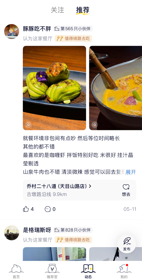 再比如【 动态 】功能,类似于美食朋友圈。会根据你的地理位置,给你推附近人写的美食图文。