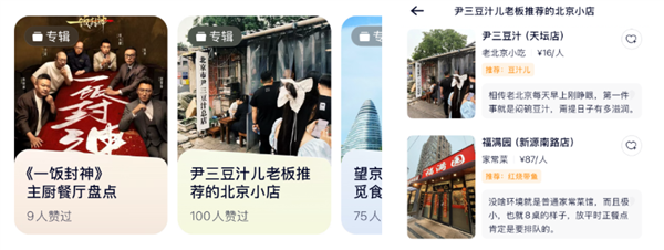 比如首页的顶部是官方整理的推荐餐厅合集,有点像网易云音乐的歌单一样,一个歌单一个题材。就比如吃饭综艺《 一饭封神 》、北京地道儿豆汁店老板推荐等等。可惜的是,因为上线实在太急了,目前满打满算就 5 个专辑。。。