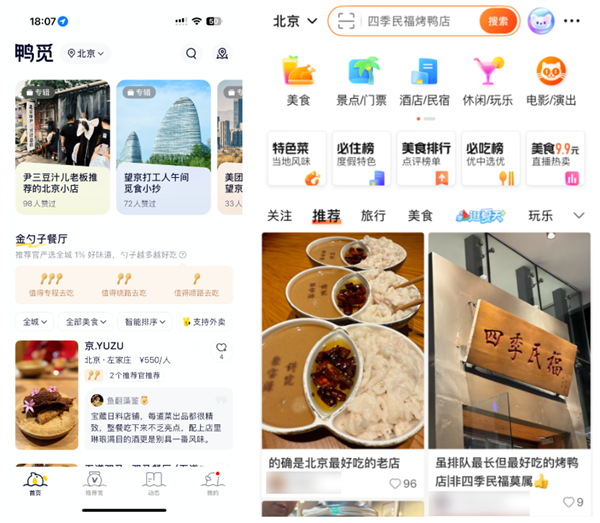 不同于大众点评又是美食排行、又是必吃榜、又是必住榜的。鸭觅就几块功能,底部的导览栏分为【 首页 】、【 推荐官 】、【 动态 】和【 我的 】。首页除了一个专辑,就是餐厅排名。信息流也是简单明了的单列显示。左为鸭觅,右为大众点评