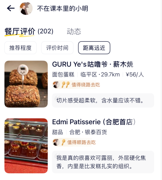 点到推荐官的主页里,可以根据距离远近来排序筛选餐厅评价。毕竟对于吃饭这件事来说,前往餐厅的成本也是一个非常重要的指标。