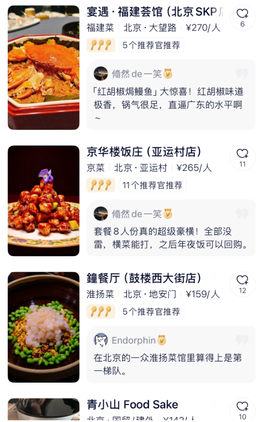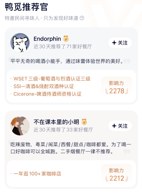 除了看勺子多少,另一个就是餐厅评价。大众点评是人人都能给餐厅打分、写评价。这模式好是好,但也给商家刷好评、买水军、删差评留了后门。鸭觅为了保证无广的纯粹性,引入了推荐官模式。官方自己去挑了一批能吃会喝的食客,或者是有名的厨师,作为推荐官入驻。