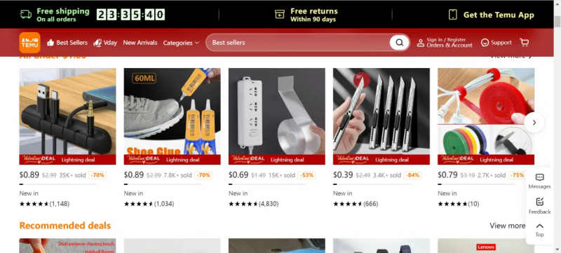 打开Temu官网,”低于1美元“商品列表赫然跃入视线。在平台上,热销商品和推荐商品的定价大都集中在0.09-20美元之间。根据浙商证券分析,Temu以家居百货、服饰鞋履为主要品类,同类单品价格远低竞对,锚定性价比为核心。