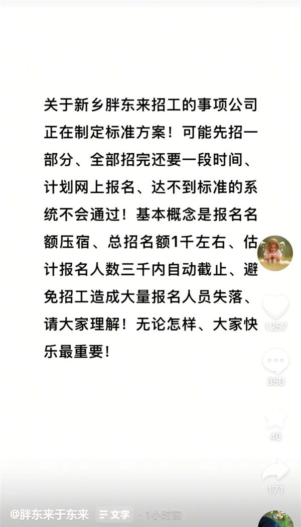 8月10日,胖东来创始人于东来对外公布了新乡胖东来三胖招工的最新细节。