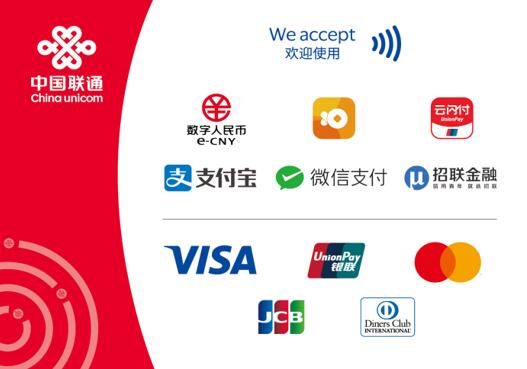 中国联通与中国银联、第三方支付机构(财付通、支付宝等)、银行、清算机构等合作伙伴紧密合作,以多元化支付方式为外籍用户提供优质、高效、便捷支付服务,在实现中国联通营业厅国际化服务升级的同时,有效扩大入境消费,服务促进国家高水平对外开放。