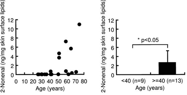 在一项日本的研究报告中显示,在 40 岁及以上的人群中才能检测到这种物质,且随着年龄增长、人体衰老,2-壬烯醛分泌量会加大,并在日常代谢中通过汗腺散发。