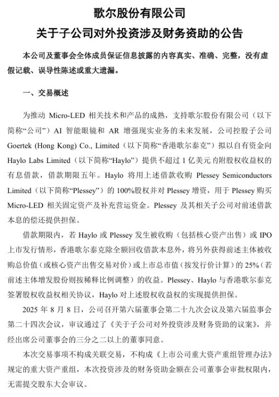 8 月 8 日,歌尔股份(002241)发布公告,为推动 Micro-LED 相关技术和产品的成熟,支持公司 AI 智能眼镜和 AR 增强现实业务的未来发展,公司控股子公司 Goertek (Hong Kong) Co., Limited(香港歌尔泰克)拟以自有资金向 Haylo Labs Limited(Haylo)提供不超过 1 亿美元的附股权收益权的有息借款,借款期限为五年。