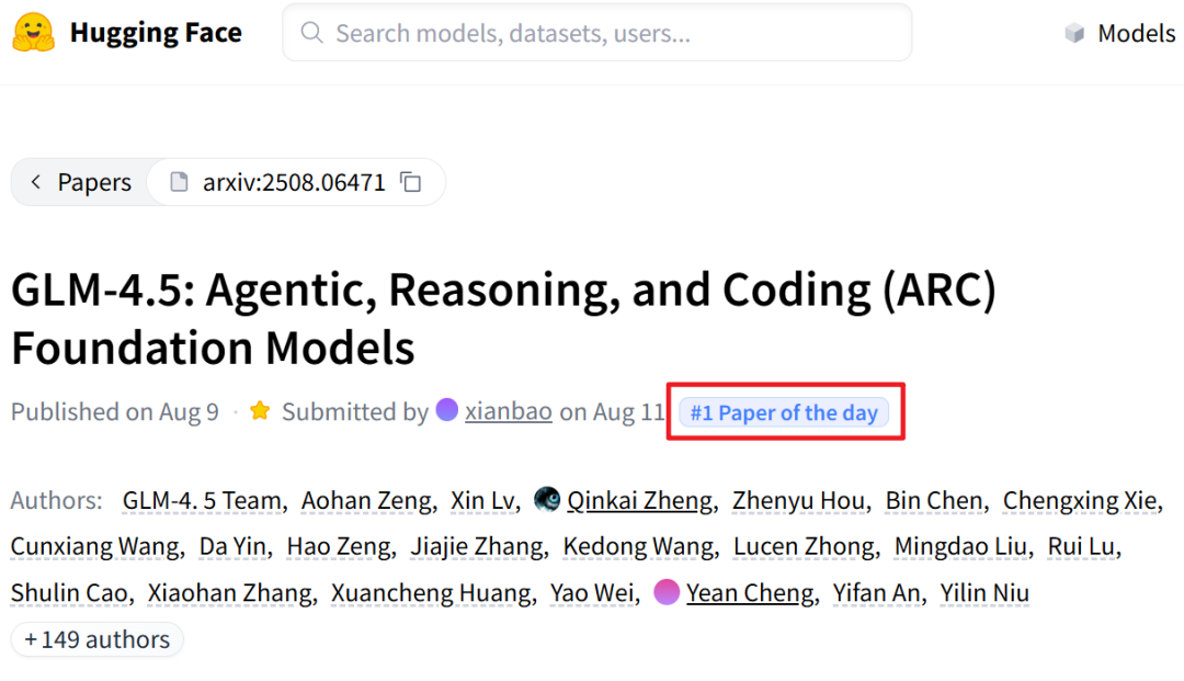GLM-4.5 技术报告也被 Hugging Face 用户投票为今天的「#1 Paper of the day」。