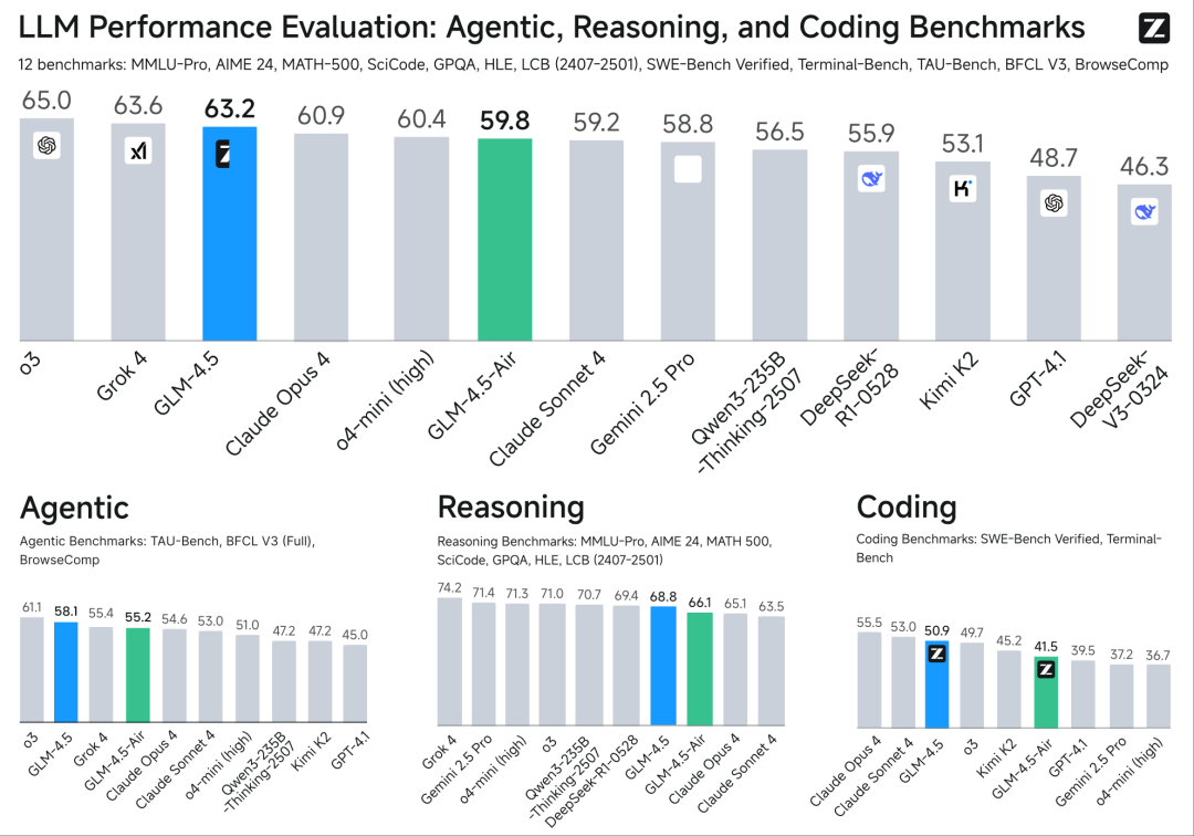 就在上个月底,智谱放出重磅炸弹 —— 开源新一代旗舰模型 GLM-4.5 以及轻量版 GLM-4.5-Air。其不仅首次突破性地在单个模型中实现了推理、编码和智能体能力的原生融合,还在 12 项全球公认的硬核测试中取得了全球第三的综合成绩。这个成绩在所有国产模型和开源模型中均排名第一!