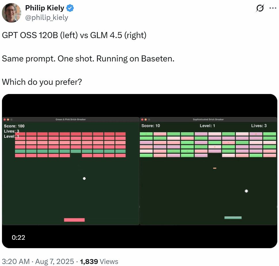 就在热度持续升温之际,OpenAI 也开源了备受期待的 gpt-oss 系列模型。网友第一时间将它与 GLM-4.5 放到一起比拼,而后者的整体表现依旧锋芒毕露。